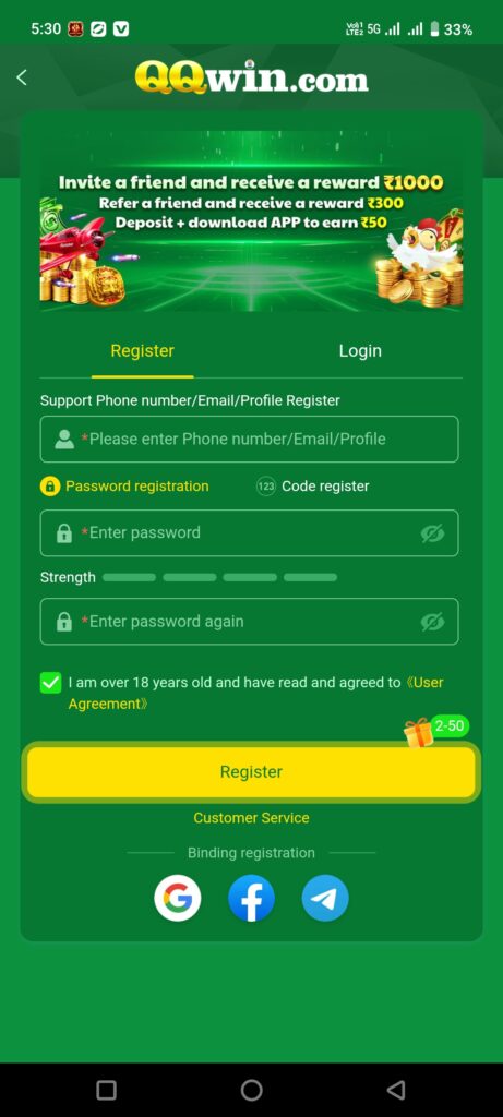 रजिस्ट्रेशन के बाद यूज़र अपने मोबाइल नंबर और पासवर्ड से QQ Win App में आसानी से लॉगिन कर सकता है। लॉगिन प्रक्रिया तेज़ और पूरी तरह से सुरक्षित होती है।